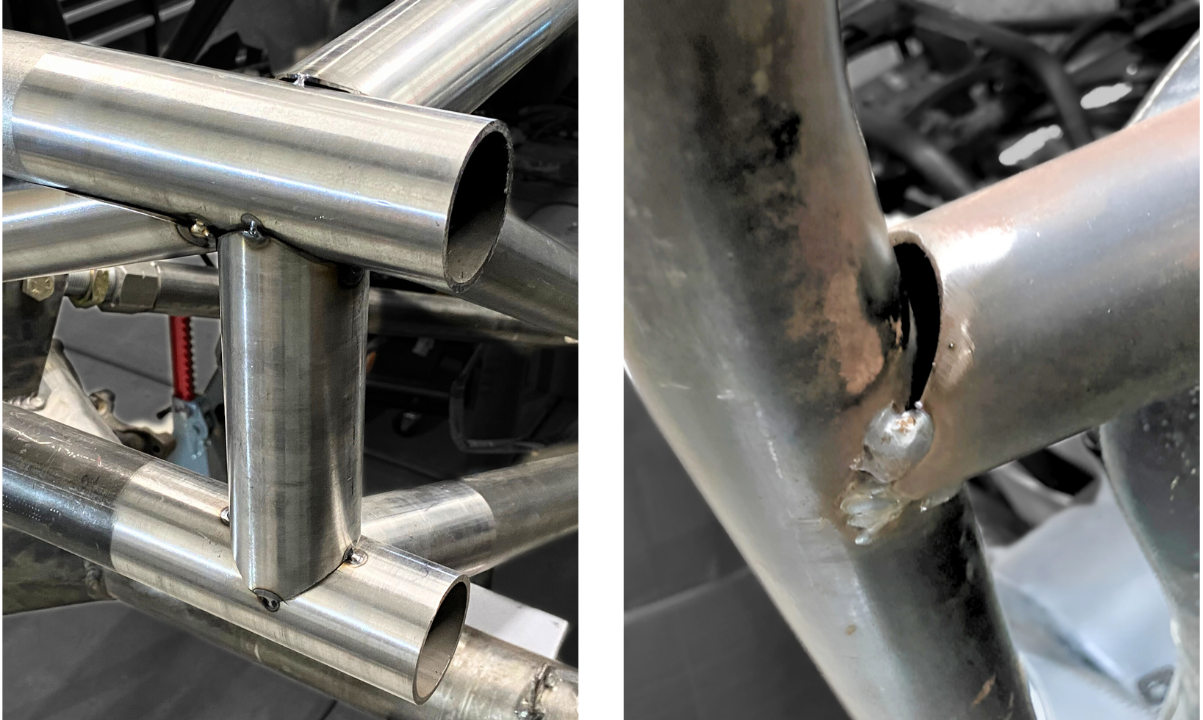 Ok so it's not exactly a head scratcher.The one on the right is sketchy at best.Actually, it's outright dangerous.Especially because it's a main support of a roll cage...You want to take a ride in this death trap? Me neither.Unfortunately this is what a lot of tube junctions look like when they are done by hand. Especially when you've got minimal tools and experience.It takes a lots of time and patience to get a notch to fit well by hand. And often you make a mistake end up doing things multiple times.That's why using an automated machine with computer designed parts is a game changer. Check it out ↓